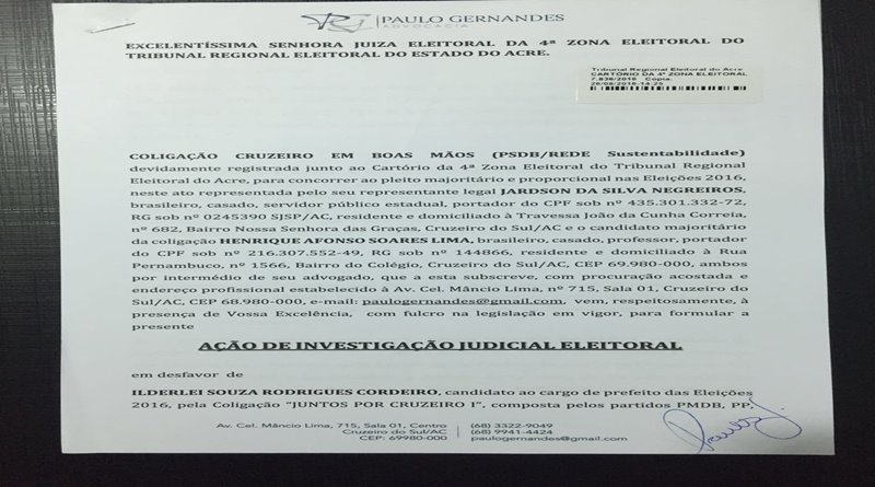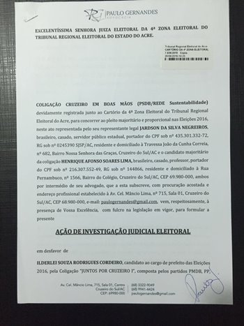 A ação que está correndo, portanto é a AIJE, protocolada no TRE/AC sob o n° 67119.2016.601.0004. A defesa tem ate o dia 4 para apresentar defesa, e o rito é sumário, ou seja, espera-se que a decisão judicial em primeira instância ocorra, no mais tardar, no dia 5/09.