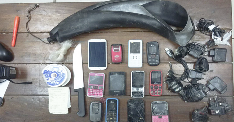 Nessa empreitada foram encontrados 12 aparelhos celulares, carregadores, uma faca e outros objetos. O material foi lançado nas dependências do presídio dentro de uma câmara de ar.