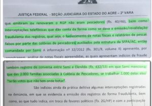 Em outra interceptação, desta vez entre Elenildo e um suposto “pescador” chamado João, Elenildo acerta a renovação das carteiras (RGP) de João e de sua mulher, ao mesmo tempo ordena que os mesmos transfiram seus títulos eleitorais para Cruzeiro do Sul.