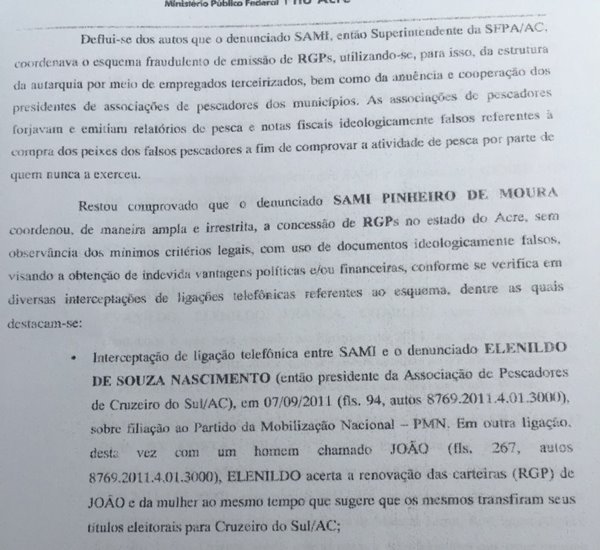 Em outra interceptação, desta vez entre Elenildo e um suposto “pescador” chamado João, Elenildo acerta a renovação das carteiras (RGP) de João e de sua mulher, ao mesmo tempo ordena que os mesmos transfiram seus títulos eleitorais para Cruzeiro do Sul.