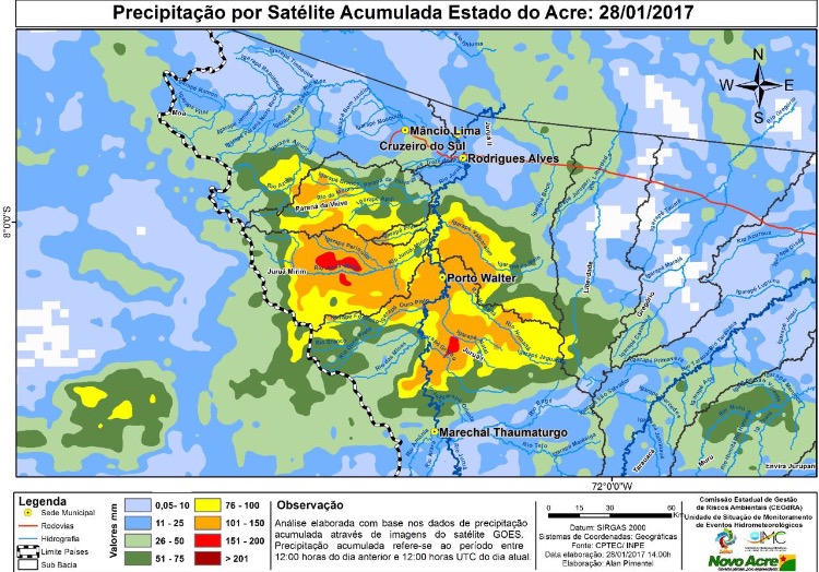 A medição da manhã deste domingo revelou que o Rio Juruá cresceu 11cm nas últimas 12 horas. Às 19h00 de sábado o Corpo de Bombeiros da cidade mediu 13,73m, mas as 06h00 de hoje a lâmina d’agua saltou 11 cm e, desta forma, superou a segunda maior marca da série histórica: 13,78m, em 2013.