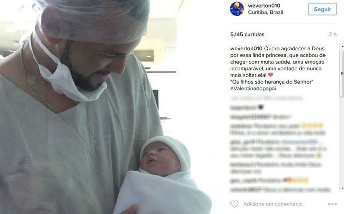 O goleiro Weverton parou a programação de treinamento por um bom motivo: o nascimento de sua filha, Valentina. A foto do goleiro segurando o bebê foi publicada na manhã desta segunda-feira e com a boa notícia de que a menina chega com saúde.