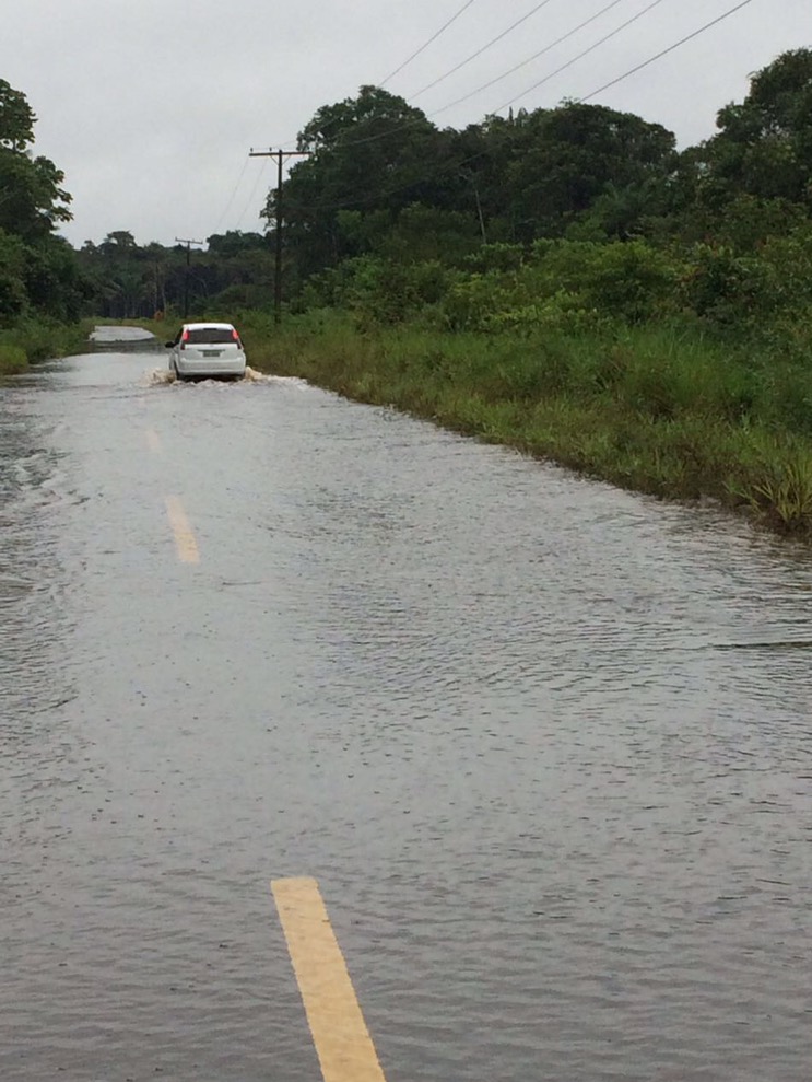 Rodovia AC 405, que liga Cruzeiro do Sul a M. Lima, com água cobrindo faixa de rolamento