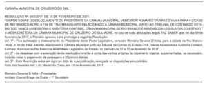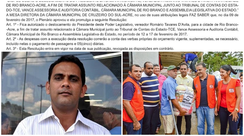 Segundo consta no Diário Oficial, as diárias são relativas aos dias 12 a 17 de fevereiro, período em que Romário Tavares estaria na capital. O problema é que o presidente não saiu de Cruzeiro do Sul nesse período, o que pode ser comprovado por meio de fotos que registraram a sua participação da doação de cestas básicas ao atingidos pela alagação junto ao prefeito Ilderlei Cordeiro e secretários, segundo o publicado na página de facebook do prefeito, na terça-feira pela tarde.