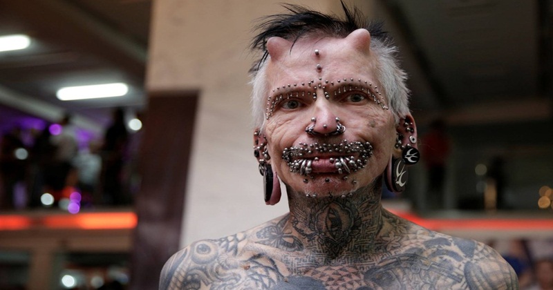 O alemão Rolf Buchholz, que aparece no livro Guinness como o homem com maior número de piercings no corpo, foi destaque de uma feira de tatuagem em Caracas, na Venezuela, no último fim de semana. Além de centenas de percings, ele conta com chifres implantados na testa.