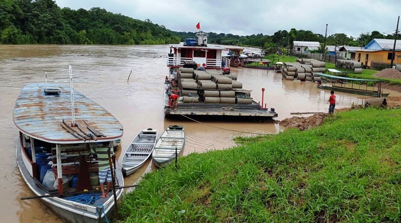 Nesta semana, após as etapas de transbordo no porto de Cruzeiro do Sul, uma balsa contendo tubos e demais maquinários chegou ao município, onde estão sendo realizadas as ações do Programa de Saneamento Ambiental e Inclusão Socioeconômica do Acre (Proser).