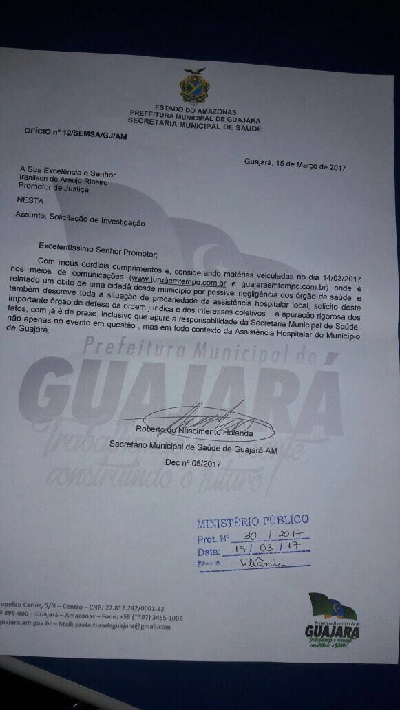 Com meus cordiais cumprimentos e, considerando matérias veiculadas no dia 14/03/2017 nos meios de comunicações (www.juruáemtempo.com.br e guajaraemtempo.com.br) onde é relatado um óbito de uma cidadã desde município por possível negligência dos órgão de saúde e também descreve toda a situação de precariedade da assistência hospitalar local, solicito deste importante órgão de defesa da ordem jurídica e dos interesses coletivos , a apuração rigorosa dos fatos, com já é de praxe, inclusive que apure a responsabilidade da Secretaria Municipal de Saúde, não apenas no evento em questão , mas em todo contexto da Assistência Hospitalar do Município de Guajará.