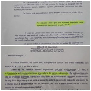 Ainda em resposta à câmara, o secretário responsabiliza o Estado do Amazonas por serviços que, segundo ele, vem sendo custeados pelo município, como medicamentos fora do âmbito do atendimento básico (de competência municipal) e o TFD.