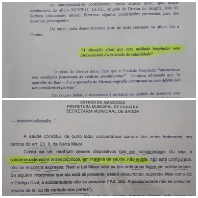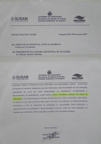 Ainda em nota à câmara de vereadores, o diretor afirma ainda que haveria dificuldade de encaminhamento à Cruzeiro do Sul por falta de combustível para as ambulâncias. O diretor alega atraso no repasse do governo do estado devido a questões burocráticas na SEFAZ. O administrador afirmou que o último repasse recebido teria sido o referente a agosto de 2016. Contudo, uma publicação no Diário Oficial do dia 24 de fevereiro indica o repasse de 46 mil reais para a unidade hospitalar do Guajará, na qualidade de ADIANTAMENTO.
