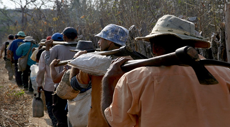 Na foto, grupo de trabalhadores é resgatado do corte de madeira para a produção de carvão vegetal, no Ceará (Foto: MTE)