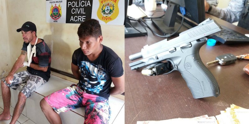 Policiais militares do Acre prenderam na manhã desta quarta-feira (5) dois homens com uma arma ponto 40. Maurício da Costa Silva, de 32 anos, e Matheus Vitorio de Souza, de 19, foram presos na Rua Judith, Baixada da Cadeia Velha, em Rio Branco. Segundo a PM-AC, o revólver – de uso restrito da polícia – seria usado para matar o cunhado de Silva, com quem tinha discutido anteriormente.