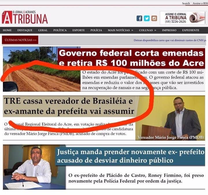 Nesta quarta-feira, dia 5, o jornal publicou, na versão web, uma manchete referente a cassação do Vereador Mario Jorge (PMDB) de Brasília, informando que o suplente na qual assumirá a vaga do vereador cassado seria um ex-amante da atual prefeita. “TRE CASSA VEREADOR DE BRASILÉIA E EX-AMANTE DA PREFEITA VAI ASSUMIR”