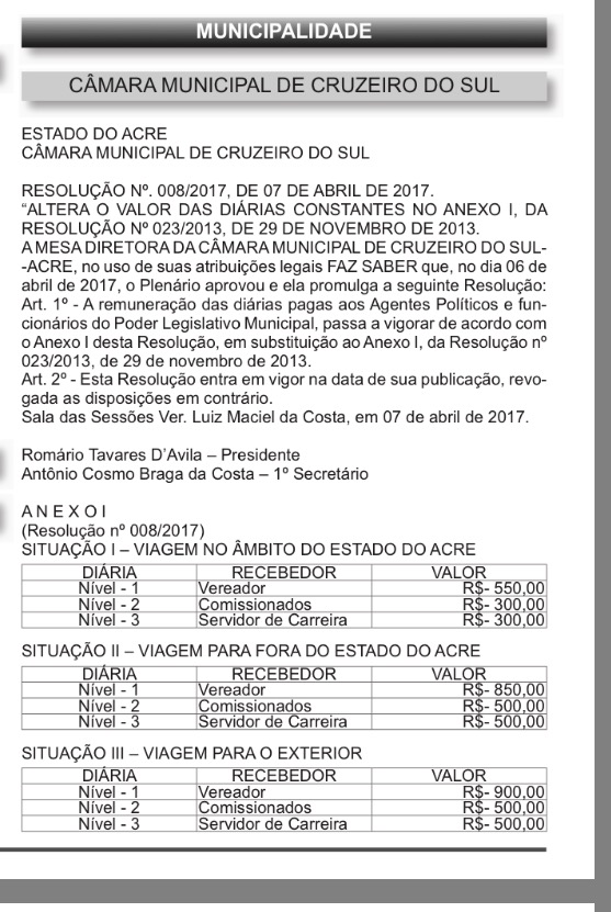 Os vereadores de Cruzeiro do Sul, Acre, aprovaram nesta quinta-feira (6) o aumento dos valores das diárias de viagem. A proposta, que prevê reajuste de 57.5% para uma modalidade, e de cerca de, 42% para outras duas.