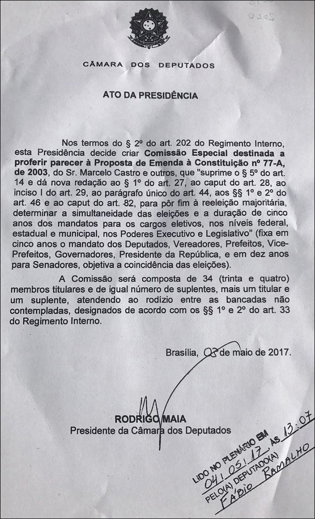 O presidente da Câmara dos Deputados, Rodrigo Maia (DEM-RJ), mandou instalar, na tarde desta quinta-feira, uma comissão especial para analisar uma proposta de emenda constitucional, apresentada pelo deputado Marcelo Castro (PMDB-PI), que estabelece a simultaneidade nas eleições para todos os cargos majoritários.