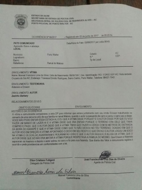 O Morador de Porto Walter, Manoel Francisco da Silva registrou um Boletim de Ocorrência no Posto Policial de Porto Walter, sob a jurisdição da Delegacia de Polícia de Rodrigues Alves em que afirma ter sido vitima de agressão pelo prefeito Zezinho Barbary (PMDB). Segundo o B.O. , tudo teria começado com uma discussão sobre a construção de uma cerca em um terreno em que a vítima é vizinho do prefeito. Manoel afirma no documento que o prefeito tentou impedir de cercar o terreno pois faria um ‘banho’ no local. Após a discussão verbal, o prefeito teria partido para as vias de fato e ameaçado de matar o vizinho.