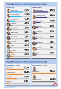 Computando apenas os votos válidos, que não contam os votos brancos e nulos e os que não responderam, Braga tem 37,4%, Amazonino 33,6%, Rebecca 15%, Ricardo 5,9%, Liliane 2,9%, Serafim 2%, Barreto 1,7%, Castro 1,1% e Jardel 0,6%.