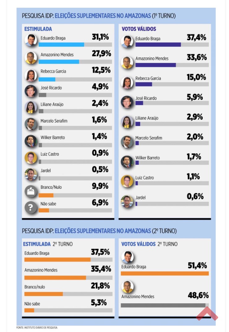 O IDP também perguntou aos eleitores sobre a intenção e voto no segundo turno. Braga e Amazonino também aparecem tecnicamente empatados: Braga teria 37,5%, contra 35,4% de Amazonino, com 21,8% de brancos e nulos e 5,3% dos que não souberam responder. Considerando a margem de erro de 2,45 pontos percentuais, Braga teria de 35,05% a 39,95% dos votos e, Amazonino, de 32,95% a 37,85%. Em votos válidos (não se computa os brancos, nulos e indecisos), seriam 51,4% para Braga e 48,6% para Amazonino.