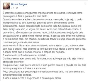 Bruna Andressa Borges, de 19 anos, estudante da Universidade Federal do Acre (UFAC), foi encontrada morta na tarde desta quarta-feira (26), em uma residência localizada na região do Círculo Militar, bairro Bosque. O fato aconteceu logo após ela ter publicado em sua rede social “Facebook” a frase: Já viram alguém morrer ao vivo? “.