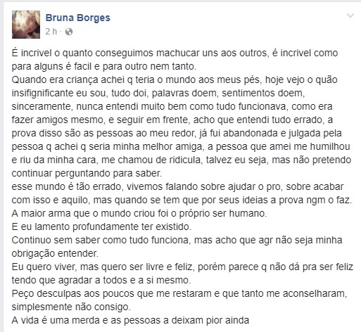Bruna Andressa Borges, de 19 anos, estudante da Universidade Federal do Acre (UFAC), foi encontrada morta na tarde desta quarta-feira (26), em uma residência localizada na região do Círculo Militar, bairro Bosque. O fato aconteceu logo após ela ter publicado em sua rede social “Facebook” a frase: Já viram alguém morrer ao vivo? “.