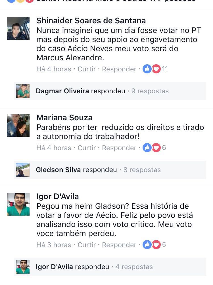 “Não é inteligente ficar posando ao lado de um presidente que tem menos de 3% de aprovação e ainda ficar agredindo senadora numa votação, num gesto extremamente antipopular. Para com isso ! Tem que fazer a sua política. Larga o Temer pra lá, rapaz. Desse jeito, só vai sustentar a base de corrupção como sempre foi. Qualquer político que tem responsabilidade com sua história política não se junta a grupos que compram deputados. Tem que votar de acordo com sua consciência, em propostas progressistas capazes de fazer reformas estruturais que o país tanto precisa. Mudanças no conceito da política trabalhista e previdenciárias são necessárias, mas não nos moldes que essa quadrilha está fazendo.”