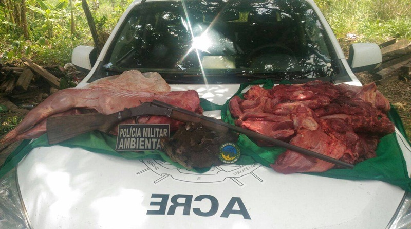Policiais militares do Batalhão de Policiamento Ambiental (BPA), apreenderam na tarde de quarta-feira, 11 de outubro, uma espingarda, calibre 28, trinta e três quilos de carnes de animais silvestres no ramal São José, zona rural de Rio Branco.