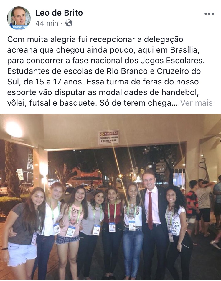 Através do seu perfil no Facebook, o Deputado parabenizou e afirmou que estará na torcida por nossos atletas. “Com muita alegria fui recepcionar a delegação acreana que chegou ainda pouco, aqui em Brasília, para concorrer a fase nacional dos Jogos Escolares. Estudantes de escolas de Rio Branco e Cruzeiro do Sul, de 15 a 17 anos. Essa turma de feras do nosso esporte vão disputar as modalidades de handebol, vôlei, futsal e basquete. Só de terem chegado até aqui são grandes campeões mas tenho certeza que farão bonito e nos darão ainda mais orgulho!”, disse o deputado.