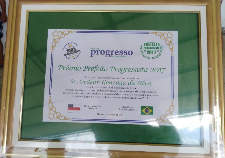 O prefeito de Guajará, Ordean Silva, recebeu na manhã desta última quinta-feira (21) o Prêmio Prefeito Progressista, da revista progressista, que tem como objetivo homenagear administradores municipais que se destacam no decorrer do ano realizando obras de interesse público e ações em benefício da coletividade. A premiação foi concedida pela aprovação e reconhecimento do trabalho realizado a frente da gestão municipal.