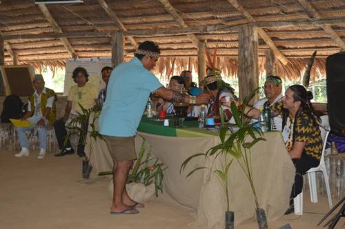 Na mesa de debates, a ayahuasca está literalmente presente, na forma de dois filtros. O vidro translúcido permite ver o seu interior. Na ponta esquerda da mesa está o líquido cor de terra, o Nixi Pãe trazido pela comitiva Huni Kuin. Na ponta direita está um de tom mais escuro: é o Hêu servido pelos anfitriões do encontro, o povo puyanawa.