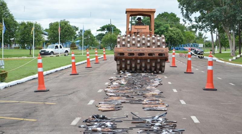 Algumas armas foram desmontadas e expostas no asfalto, em Porto Velho. Em seguida um rolo passou por cima delas para que fossem trituradas e depois serem levadas para um forno.