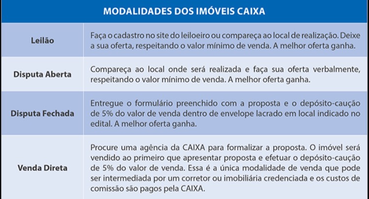 Os imóveis podem ser adquiridos de quatro formas, conforme quadro abaixo: leilão, licitação fechada, licitação aberta ou venda direta. Todas as unidades já possuem garantia da documentação regular e as contas de condomínio e IPTU quitadas até a data da compra.