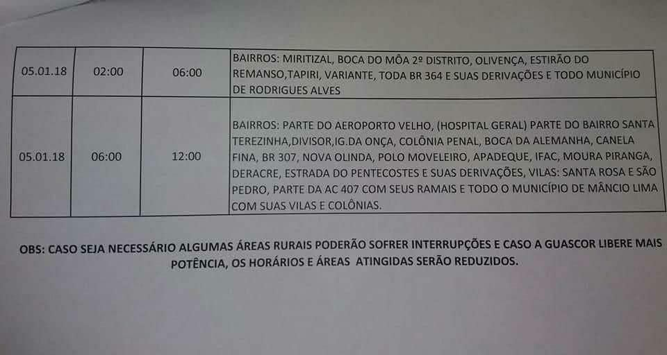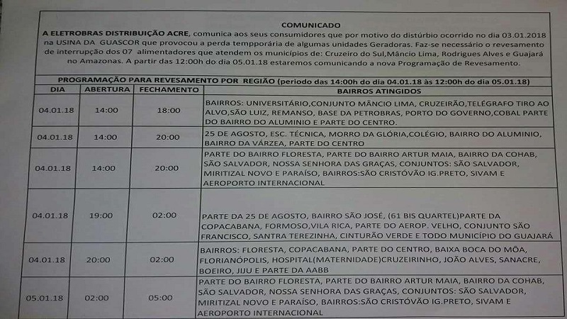 A Eletrobrás, divulgou na tarde desta quarta feira, 04, a programação do revezamento de energia elétrica para os bairros da cidade de Cruzeiro do Sul, além dos municípios de Mâncio Lima, Rodrigues Alves e a cidade amazonense, de Guajará.