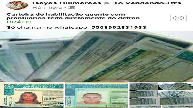 Os grupos de vendas nas redes sociais e Whatsapp são utilizados pelos estelionatários para a venda de  falsificação de documentos e outras coisas ilícitas, os mesmos não fazem nem questão de esconder o rosto, e ainda utilizam fontes dos órgãos público para realizarem as vendas.