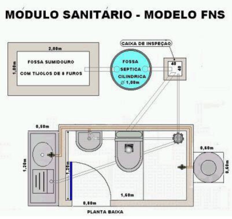 O projeto de construção de banheiros obedece a um modelo padronizado. O módulo sanitário é composto de: privada com vaso sanitário, chuveiro, caixa d’água, lavatório de louça pequeno, tanque de lavar roupas de marmorite ou similar, caixa de inspeção, tanque séptico e sumidouro (fossa absorvente). Este deve ser construído em locais onde não haja a possibilidade de contaminação do lençol freático, não sendo permitida sua construção em locais sujeitos a inundações, a fim de evitar a contaminação dos poços e fontes de abastecimento de água. As partes de alvenaria, instalações hidráulicas e acabamento estão a cargo de uma construtora contratada.
