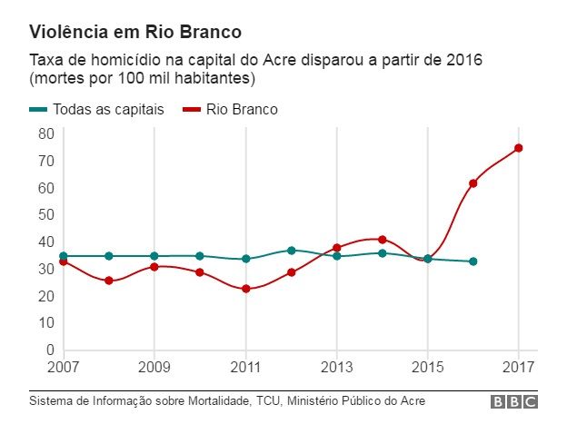 A situação muda quando Rio Branco é analisado separadamente. Na capital acreana, o número de mortes para cada 100 mil habitantes saltou a partir de 2015, de cerca de 40, dentro da média nacional das capitais brasileiras, para próximo a 75. Na cidade de São Paulo, por exemplo, são 15 homicídios/100 mil habitantes.