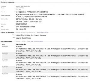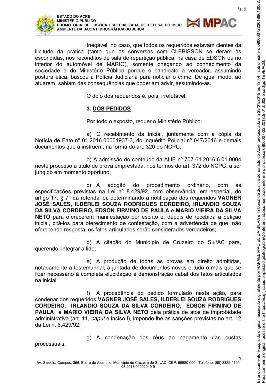 Ocorre que, a ação relatada na AIJE envolveu também o então prefeito de Cruzeiro do Sul, Vagner Sales, que teria utilizado estrutura da prefeitura, além do envolvimento do seu então chefe de gabinete, Mário Neto. O novo promotor eleitoral na cidade, Rafael Maciel da Silva entendeu que o caso configura também improbidade administrativa e abriu uma ação nesse sentido contra os envolvidos na primeira AIJE.