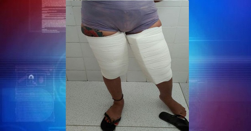 Em face disso, a mesma foi conduzida para a Unidade de Segurança Pública de Sena, sendo revistada por uma agente. No total, foram encontradas 4 barras de maconha que estavam presas com ataduras e esparadrapos nas coxas da mulher. Além disso, outros 2 tabletes foram localizados em seu sutiã. De acordo com a PM, após a pesagem em uma balança de precisão, a droga totalizou Um quilo e meio.
