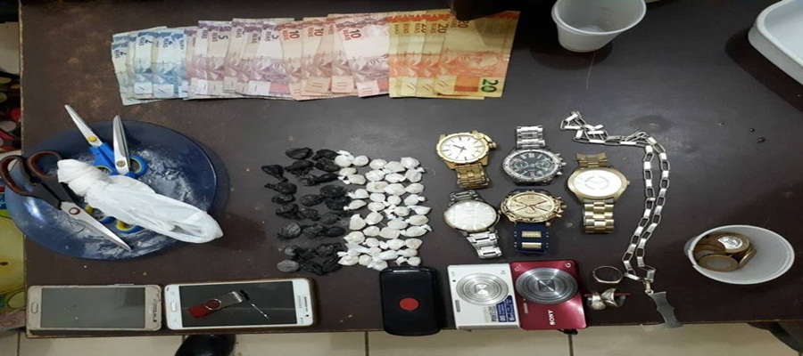 Durante buscas na parte externa e interna da casa foram encontradas 64 trouxinhas de substância aparentando ser cocaína e oxidado, além de 250 reais em dinheiro e material sem procedência como: televisão, celulares, jóias, motosserra, roçadeira, cinco relógios e duas câmeras digitais, além de material para embalar drogas.