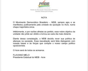 Em nota divulgada após a reunião, o presidente regional do MDB, deputado federal Flaviano Melo, destaca que seu partido “sempre agiu e se manifestou publicamente pela unidade da oposição no Acre, numa chapa majoritária única. Infelizmente, e por razões alheias ao partido, esse nobre objetivo da unidade não pôde ser obtido e tornou-se cada dia mais distante”, revelando o desconforto dos dirigentes emedebistas com a indecisão do senador Gladson Cameli.