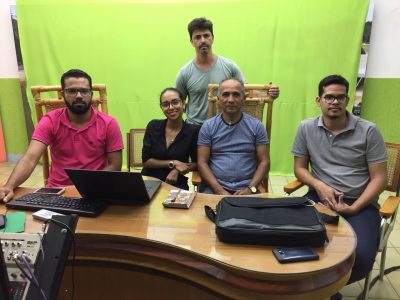 Primeira reunião da equipe do ‘Voz do Juruá’; da esquerda para direita: Richard Silva, Mona Moura, Leandro Altheman, o apresentador Paulo Amorim e o diretor Paulo Sá.