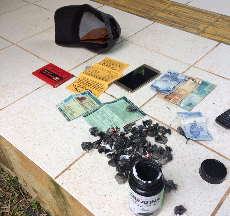 Após denúncia anônima policiais chegaram ao indivíduo, de posse de informações que ele estava com arma de fogo e drogas, foi realizado uma busca pessoal e no interior do veículo, sendo encontrado pelos policiais militares 47 papelotes de substância entorpecente e pequena quantia em dinheiro.