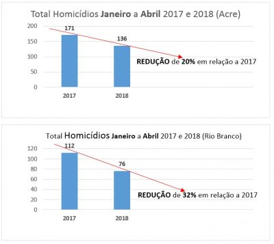 Quando comparados os períodos de janeiro a abril de 2017 e 2018, a redução de 20% no Acre e de 32% quando analisada apenas a capital Rio Branco.