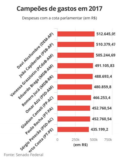 Já Gladson Cameli (PP-AC) aparece em sétimo lugar entre os dez senadores considerados campões de gastos em 2017. Segundo a reportagem, os valores anuais reembolsados pelo senador seriam da ordem de R$466.253,00.
