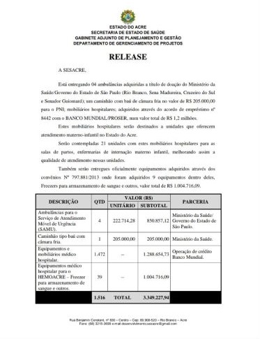 Segundo informações da SESACRE, Unidades Hospitalares em Rio Branco, Sena Madureira, Cruzeiro do Sul e Senador Guiomard serão beneficiadas com uma nova ambulância cada uma. Além das ambulâncias, também estão previstas as entregas de um caminhão baú refrigerado para o programa de imunização e mobiliários hospitalares para 21 unidades de saúde que realizem atendimento materno infantil.