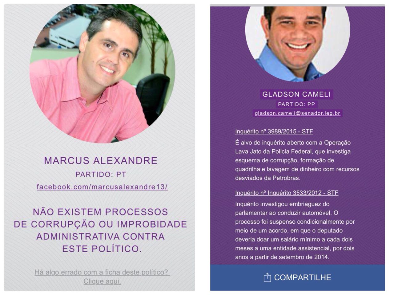 Já no caso de Gladson Cameli (PP), o aplicativo cita dois inquéritos abertos, uma investigação no STF referente à Operação Lava Jato e outro por embriagues ao volante.