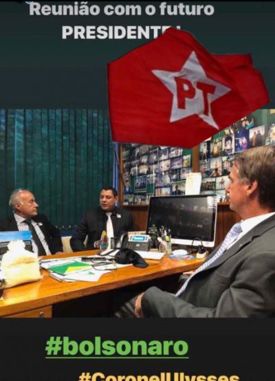 Na sua manifestação, o Coronel Ulysses vem a público no seu jeito “arrasa-quarteirão”. Olhe o que ele escreveu: “Não sei se fico alegre ou se fico (sic) triste ao receber prints de grupos de debate político da oposição “oposição” que tentam ofender a minha dignidade e minha honra, a dignidade e a honra do Bolsonaro, a dignidade e a honra do Bocalom ao (e ele destaca em caixa alta o que vai a seguir) forjarem de maneira mentirosa e covarde uma foto de reunião de Ulysses, Bolsonaro e Bocalom com uma bandeira do PT…”.