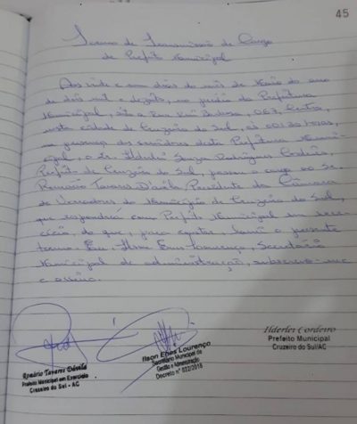 Na semana passada, nossa reportagem já havia feito a denúncia de que a irmã do prefeito Ilderlei Cordeiro estaria despachando no seu gabinete durante sua ausência. Após a denúncia, também de um vereador, a administração municipal apresentou como ‘prova’ de que o cargo de prefeito estaria sendo ocupado pelo presidente da Câmara, Romário Tavares, um papel escrito a mão, que consta o carimbo, mas não a assinatura do prefeito. Testemunhas afirmam que Romário Tavares (PMDB) sequer esteve na prefeitura durante o período.