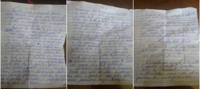 Na carta, os presos afirmam que os agentes penitenciários entraram nos pavilhões B e C e fizeram ameaças aos detentos e seus familiares. Além disso, os tiraram das celas e iniciaram as torturas.