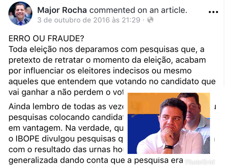 Sob o título “Erro ou fraude”, com letras garrafais e seguida de um ponto de interrogação, o deputado federal Major Rocha (PSDB), atual pré-candidato a vice governador na chapa de Gladson Cameli, que já foi um jornalista mediano, arvorou-se, às vésperas das eleições de 2016, a comentar os resultados de uma pesquisa do mesmo Instituto Delta, que acaba de divulgar, ao que tudo indica, os primeiros números da corrida eleitoral deste ano. Como naquele ano de 2016 os números não eram nada favoráveis aos candidatos que concorriam sob a asa do senador, ao contrário do momento, ele detonou o mesmo Instituto Delta que ele agora aplaude. Veja o que escreveu sua excelência: