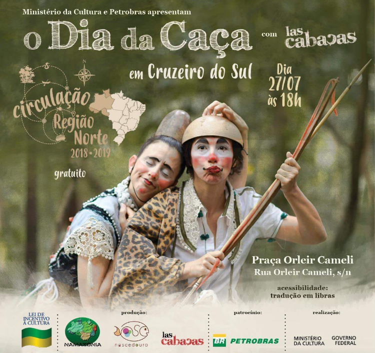 A peça foi apresentada em Rio Branco e Xapuri nos dias 20 e 22. A programação do projeto de circulação pelo Acre do “O Dia da Caça” é promovida pela Nascedouro Gestão Cultural, Namazônia e Las Cabaças, por meio do Edital Petrobras Distribuidora de Cultura 2018/2019, através da Lei Rouanet do Ministério da Cultura (MinC).