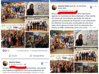 As viagens foram registradas em seguidas postagens nas redes sociais da deputada Jéssica Sales, com fotos e vídeos, as quais já foram apagas provavelmente porque a parlamentar se deu conta de que havia cometido uma ilegalidade ao gastar dinheiro público com atividades partidárias.
